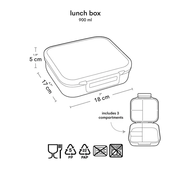 Déjeunez avec style grâce à cette boîte à lunch aux couleurs vives issue de la collection mini. La boîte à lunch comporte 3 compartiments pour différents en-cas. Le couvercle se ferme hermétiquement grâce à sa charnière et à son joint en silicone, afin que tout reste bien frais. Avec un sac à dos et une gourde assortis, votre tout-petit ou votre enfant en bas âge est fin prêt pour une journée à l'école ou à la crèche.