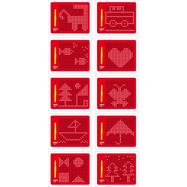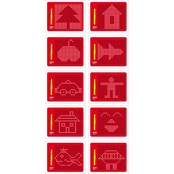 Tableau magnétique de 215 x 12 x 170 mm, de couleur rouge. Le tableau comprend un crayon jaune à pointe métallique à utiliser sur le tableau. Il comprend également 10 cartes avec un total de 20 exemples.
