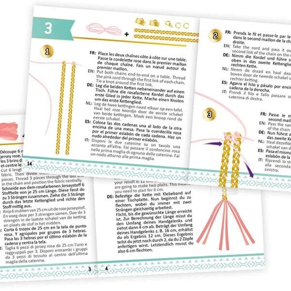 - Contenu: 1 cordon rose, 1 cordon de suédine verte, 1 bande de tissu jersey rose, 4 chaînes plaquées or, 6 anneaux plaqués or, 4 grandes pinces à lacet, 2 petites pinces à lacet, 3 fermoirs crabe, notice en couleur et 6 langues (néerlandais, allemand, anglais, français et italien)