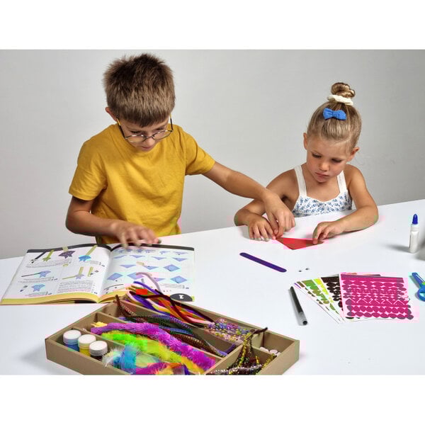 Une boîte contenant du matériel créatif pour les enfants à partir de 4 ans.