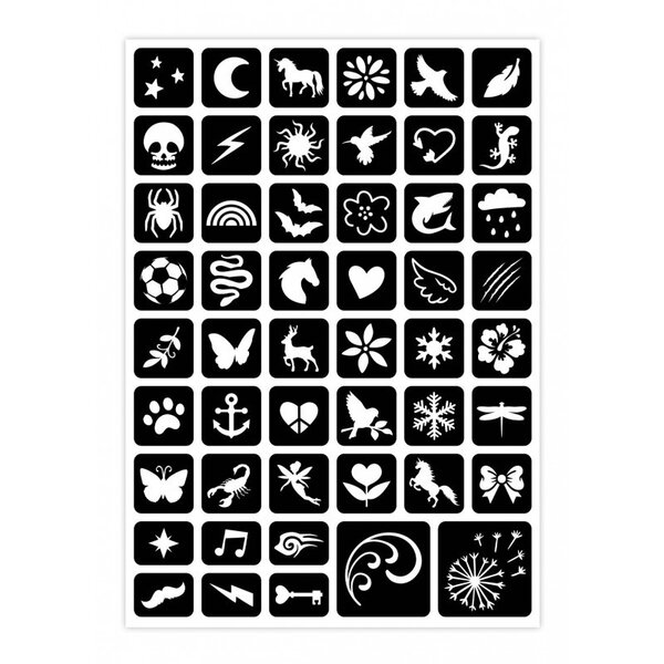 - Contenu : 4 feutres à tatouer, 3 encres à tatouer, 4 feuilles de tatouages temporaires, 2 pots de paillettes, 1 flacon de colle cosmétique et 50 pochoirs autocollants.