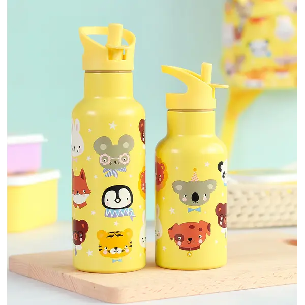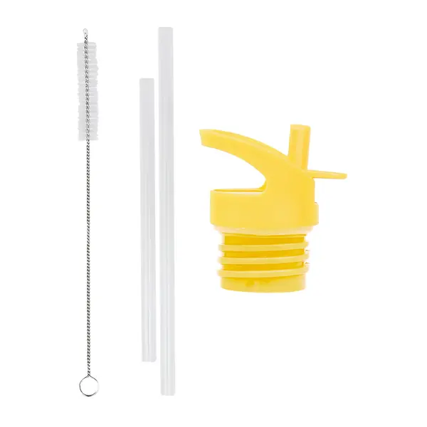 Set pour bouteilles comprenant un bouchon jaune, une paille et une brosse pour les bouteilles en acier inoxydable de 350 et 500 ml de A Little Lovely Company.