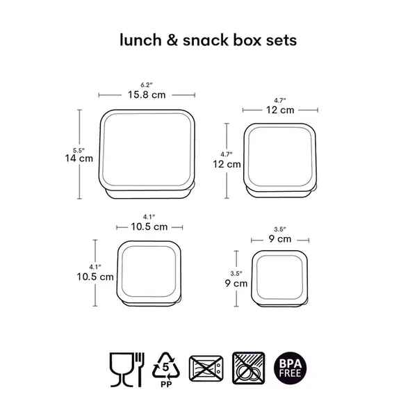 - Dimensions : boîte à lunch 15,8 x 14 x 7 cm, grande boîte à collation 12 x 12 x 5,5 cm, boîte à collation moyenne 10,5 x 10,5 x 5 cm, petite boîte à collation 9 x 9 x 4,5 cm