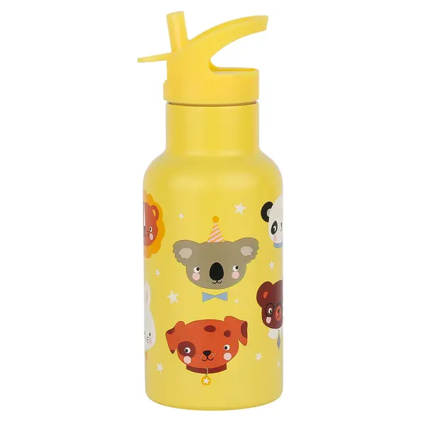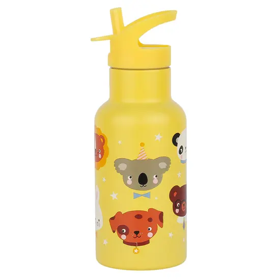 La gourde jaune en acier inoxydable avec des animaux est idéale pour emporter à l'école. La gourde pour enfants est à double paroi, ce qui permet de garder les boissons au frais. La gourde de 350 ml est livrée avec un bec verseur et une paille pour les boissons froides. Un bouchon à vis en acier inoxydable pour les boissons chaudes est disponible séparément.