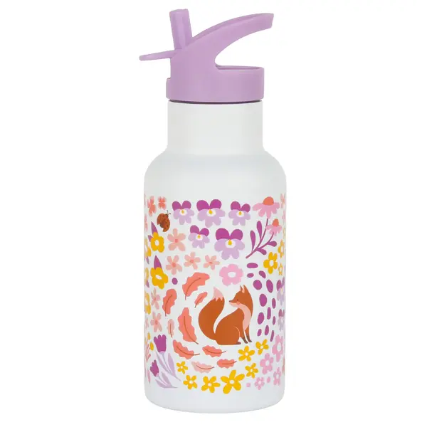 La gourde en acier inoxydable lilas avec des fleurs et des renards est idéale pour emporter à l'école. La gourde pour enfants est à double paroi, ce qui permet de garder les boissons au frais. La gourde de 350 ml est livrée avec un bec verseur et une paille pour les boissons froides. Un bouchon à vis en acier inoxydable pour les boissons chaudes est disponible séparément.