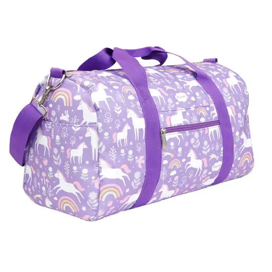 Le sac de week-end spacieux, violet, avec des licornes, des fleurs et des arcs-en-ciel, est idéal pour les vacances, les soirées pyjama ou comme sac de sport. Ce sac polyvalent est doté de deux poignées et d'une bandoulière réglable et amovible pour un confort optimal. Le sac se compose d'un compartiment principal avec une poche intérieure, de deux poches latérales et d'une poche zippée à l'avant. De plus, le sac peut être utilisé comme bagage à main (vérifiez toujours les directives de la compagnie aérienne).