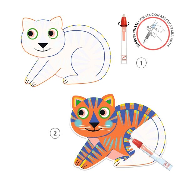 Coloriage à l'eau, adapté aux enfants à partir de 18 mois. L'enfant colorie les animaux avec le stylo à eau et découvre ce qui se cache derrière les zones blanches. Magique : des motifs qui changent de couleur apparaissent ! Une fois les planches de coloriage sèches, l'enfant peut recommencer !
