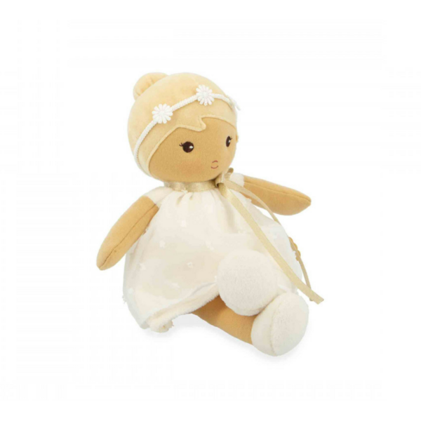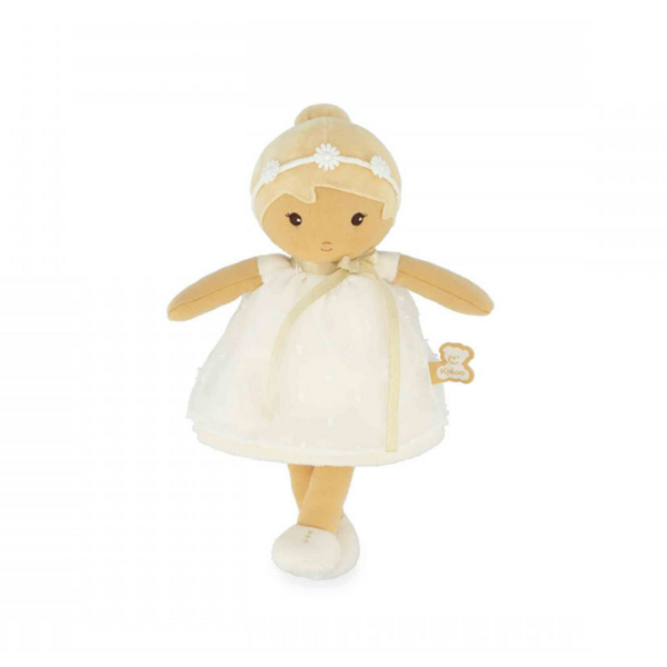 Découvrez Daphne : une magnifique poupée en tissu élégante de 25 cm ! Elle convient aux bébés dès la naissance et fait partie de la collection de poupées Tendresse de Kaloo. Daphne est élégamment vêtue d'une robe en organza ivoire à pois, prête à célébrer des moments précieux tels qu'un baptême ou un mariage. Sa coiffure relevée magnifiquement stylée lui confère une touche de distinction et ses chaussures assorties complètent son look raffiné et élégant. Daphne est une poupée qui reflète la pureté et la douceur des moments précieux. Sa tenue éthérée est rehaussée d'une délicate couronne de fleurs, comme une dernière touche poétique. Avec son regard paisible et son apparence délicate, Daphne invite à la douceur et à la rêverie. Elle semble tout droit sortie d'un instant figé, où le silence apaise et les gestes tendres réconfortent. Elle incarne ces moments paisibles où l'on prend le temps de ressentir, comme une légère brise qui caresse la peau. Incroyablement douce, facile à saisir pour les petites mains, elle deviendra rapidement la parfaite compagne de câlins. Discrète et charmante, Daphné s'intègre naturellement dans la vie quotidienne d'un tout-petit. Un petit ruban cousu dans son dos permet d'écrire le nom du bébé, ce qui en fait une amie unique et précieuse. Emballée dans une jolie boîte, elle constitue un cadeau de naissance original, plein de douceur et de fantaisie. Elle est également parfaite comme première poupée pour stimuler l'imagination d'un enfant. Cette poupée en tissu est soigneusement fabriquée à partir d'au moins 80 % de matériaux recyclés, y compris le rembourrage en polyester recyclé. Cette adorable poupée est lavable en machine à 30 °C et prête à être adoptée et aimée pendant des années !