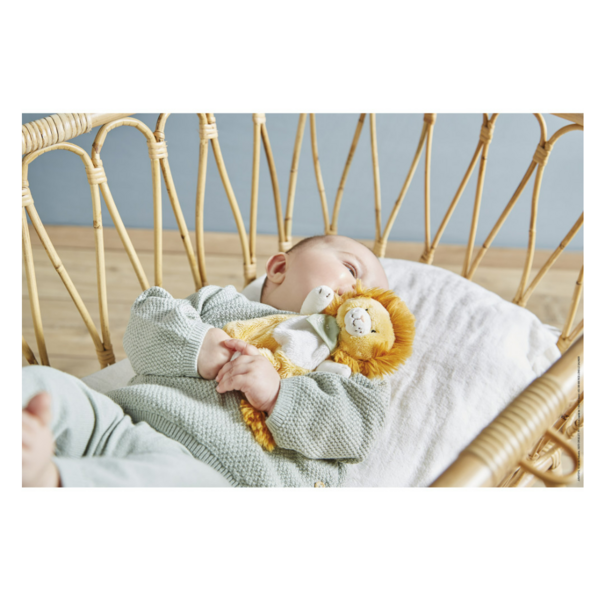 Le lion deviendra sans aucun doute le nouveau meilleur ami de votre bébé ! Cette peluche lion, adaptée dès la naissance, a tout pour plaire : des éléments faciles à saisir pour les petites mains, une douceur intense, un joli visage et une forme et une taille adaptées aux tout-petits. Il s'appelle Nougat, le lion espiègle qui incarne la loyauté et la sagesse. Ils symbolisent l'amour et les câlins, et font partie de notre collection Les Ami de Kaloo. Le bandana vert – symbole caractéristique de cette collection – est en coton et se noue autour du cou de l'animal pour un look plus délicat. Il est également orné de broderies sur le thème de la nature, afin de renforcer le lien entre le petit lion et son habitat naturel. Cette peluche plate mesure 18 cm de haut et a été conçue pour offrir les meilleurs câlins : un ventre ultra-doux contrasté et des pattes faciles à attraper. Sans oublier leur crinière flamboyante ! Cette petite peluche lion est aussi mignonne que douce, ce qui en fait le cadeau idéal pour un nouveau-né. Peut-être que votre tout-petit deviendra aussi naturellement audacieux et attentionné que notre cher Nougat ? Avec son regard amical et sa personnalité adorable, ce petit lion est prêt à accompagner bébé pour la vie. Fabriqué en fourrure synthétique (polyester) et rembourré de polyester recyclé. Cette peluche lionceau facile d'entretien est lavable en machine. Il est temps pour bébé de rencontrer son nouveau petit ami !