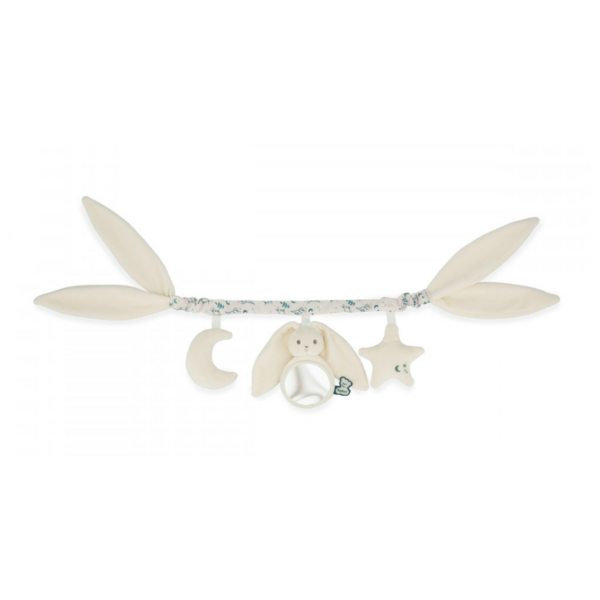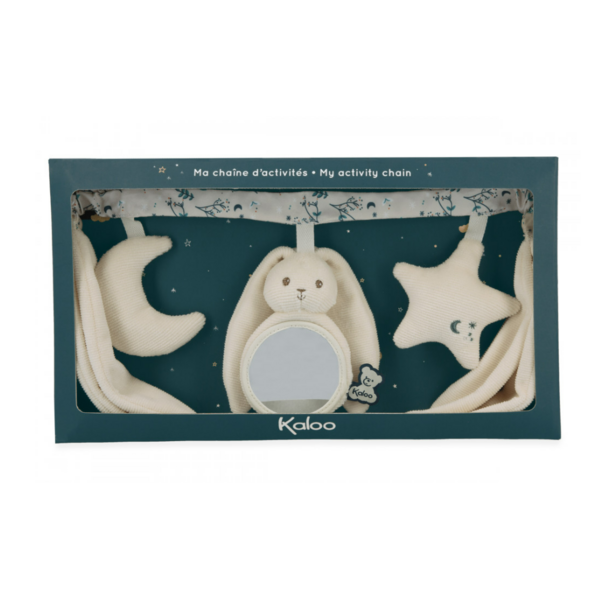 Une chaîne d'activités Lapinoo pour les promenades avec votre bébé ! Adaptée dès la naissance, elle est idéale pour proposer des jeux stimulants à votre tout-petit lorsqu'il est dans sa poussette ou allongé dans sa chambre douillette. Le lapin de couleur crème est à l'honneur : grâce à ses grandes oreilles de chaque côté, vous pouvez suspendre le jouet pour bébé. Chaque jouet suspendu est conçu pour stimuler les sens du bébé lors de vos sorties : une lune en papier bruissant, une petite peluche lapin avec un miroir pour se regarder et une petite étoile à secouer. Oui, grâce aux grandes oreilles de nos lapins Kaloo, ils peuvent saluer le ciel ! Cette chaîne d'activités de couleur crème est fabriquée en velours côtelé, en popeline (polyester) et en rembourrage polyester recyclé. Elle aide à développer le toucher, la vue et l'ouïe du bébé. Pratique et ultra-doux, c'est l'accessoire pour poussette qui accompagnera bébé dans toutes ses sorties. À la naissance, c'est toujours une bonne idée d'offrir un jouet d'éveil qui stimule le développement sensoriel de bébé ! Ce jouet portable est de couleur crème, mesure 40 cm de long et est entièrement lavable en machine à 30 °C.