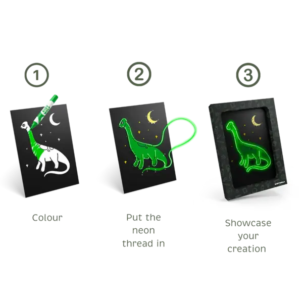 - Contenu : kit KIDYENON, 3 panneaux pré-perforés sur le thème des dinosaures, 1 fil néon de couleur verte, alimentation par piles (non fournies), mode d'emploi