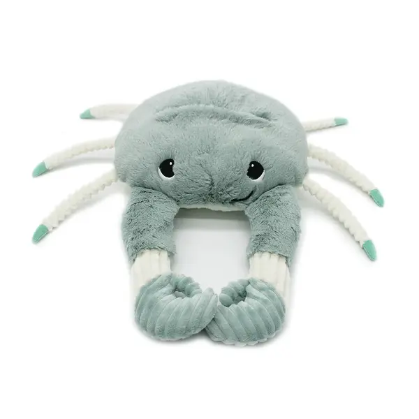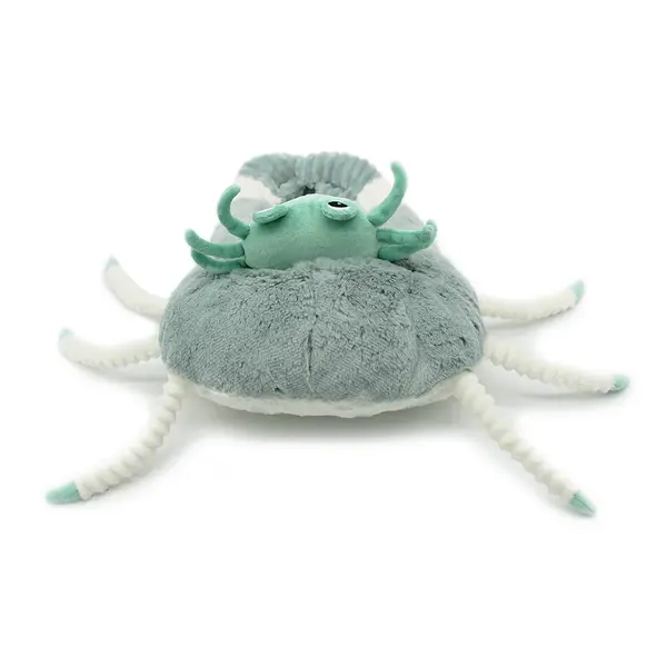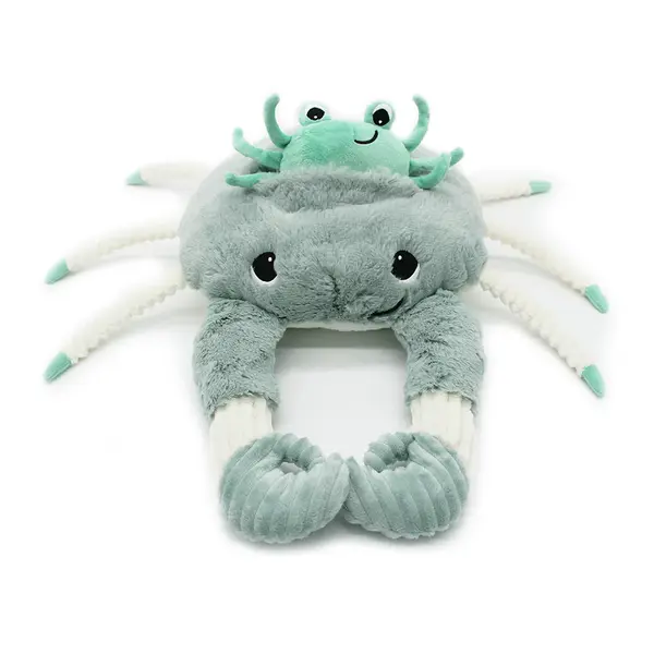 La peluche Ptipotos crabe vert menthe de 46 cm est vendue avec son bébé caché sur son dos.