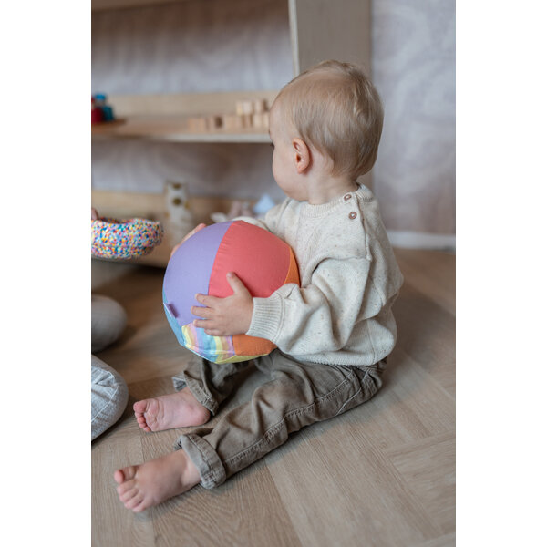 Le ballon sensoriel est une housse en tissu doux dans laquelle on glisse un ballon. On obtient ainsi une balle légère et colorée qui dure des semaines et qui est parfaite pour jouer à l'intérieur. Comme le ballon se déplace plus lentement, c'est un jouet idéal pour apprendre aux jeunes enfants à lancer et à attraper. Il stimule de manière ludique leur motricité et leur coordination œil-main.