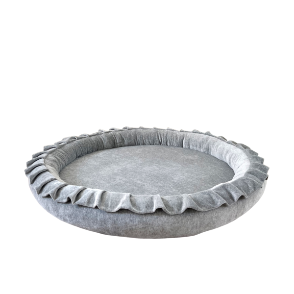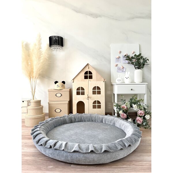 Tapis de jeu rond, recouvert d'une housse en velours de coton doux, fini avec des volants élégants.