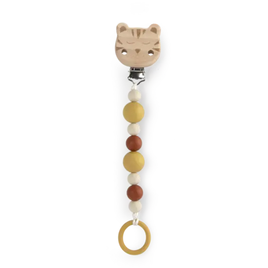 Attache-sucette en bois et silicone à motif tigre, pour ne plus perdre la sucette de votre bébé. Grâce à son clip réglable, vous pouvez la fixer à toutes les surfaces. Les perles en silicone sont sans danger pour les enfants, qui peuvent jouer avec et les mâchouiller sans souci.