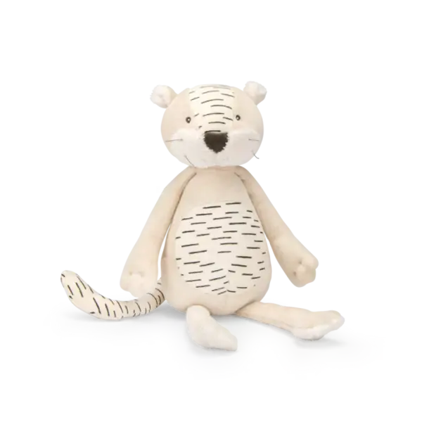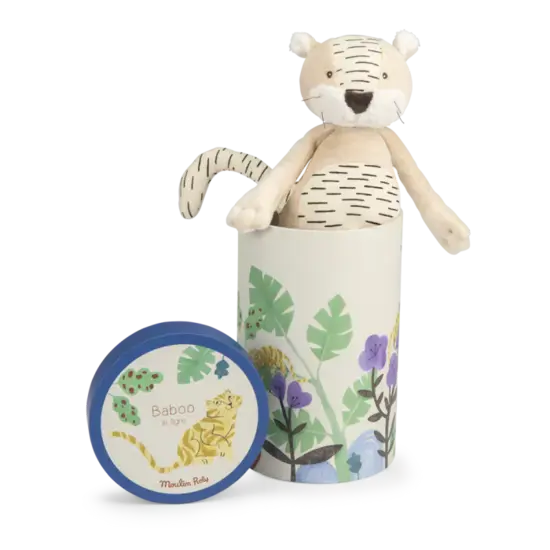 Baboo, le tigre un peu paresseux, est toujours prêt à faire un câlin. Avec ses formes rondes, son pelage couleur crème et ses rayures graphiques, il est le compagnon idéal des enfants. Il est présenté dans une boîte magnifiquement illustrée d'aquarelles d'Élodie Coudray.