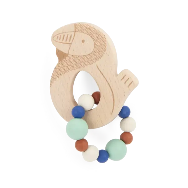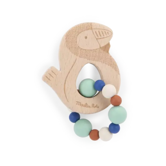 Mâchouiller ou jouer ? Tout est possible avec ce hochet en bois et silicone en forme de calao. Il est rond et facile à attraper. Composé de deux matières différentes, il soulage les dents douloureuses de votre bébé.