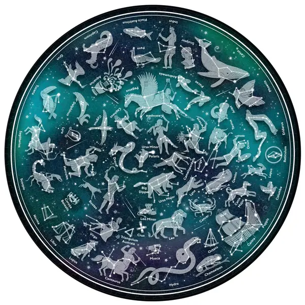 En assemblant ce puzzle extraordinaire, vous suivrez les constellations des hémisphères sud et nord, telles que Cassiopée et la Grande Ourse/le Grand Chariot.