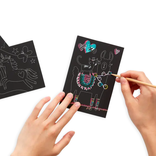 Commencez à gratter, car toutes sortes d'aventures animales vous attendent ! Ces cartes à gratter Funtastic Friends regorgent d'instructions faciles à suivre pour révéler des œuvres d'art arc-en-ciel inspirées des animaux, avec des licornes, des lamas, des paresseux et bien d'autres encore. Avec leurs dimensions de 10 x 15 cm, ces mini-kits de grattage pour enfants sont parfaits pour les déplacements. Chaque kit contient non seulement 4 cartes adorables avec des illustrations d'animaux, mais aussi 2 cartes vierges pour créer vos propres dessins, qui révèlent tous un arc-en-ciel de couleurs à l'aide du stylet en bois fourni.