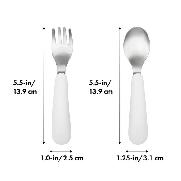 La fourchette et la cuillère ont des manches épais antidérapants qui tiennent parfaitement dans les petites mains. Comme les manches ne sont pas complètement ronds,