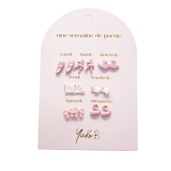 7 paires de boucles d'oreilles en céramique et acier inoxydable, avec une paire par jour de la semaine. Chaque ensemble est livré dans une belle enveloppe cadeau.