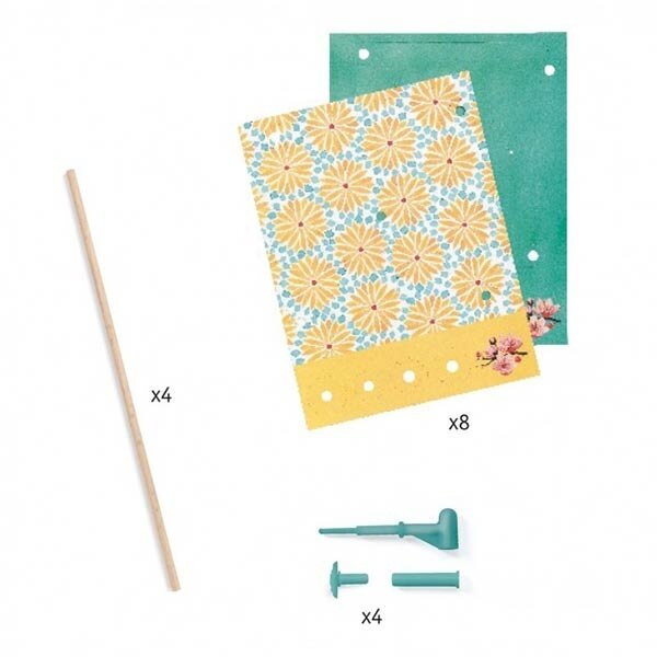 - Contenu: 8 feuilles prédécoupées et imprimées, 4 attaches en plastique, 4 bâtonnets en bois et un livret d'instructions