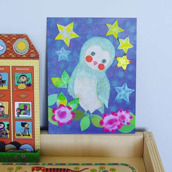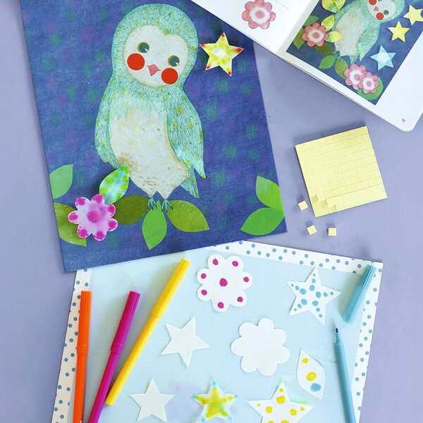Une première expérience unique dès l'âge de 3 ans. L'enfant détache une forme du papier calque et la place sur le papier absorbant. Il trace quelques points à l'aide d'un feutre. Il verse ensuite une goutte d'eau à l'aide de la pipette : l'encre se répand... Un résultat fantastique ! Une fois le dessin sec, il fixe l'autocollant double face sur les côtés illustrés et peut décorer sa chambre.