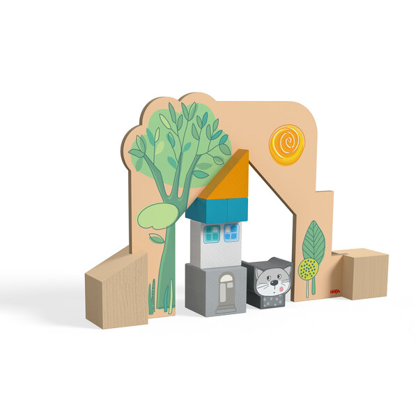 En route vers ta première maison ! À l'aide d'un gabarit ou en toute liberté, les petits maîtres et maîtresses d'œuvre à partir de 3 ans peuvent construire une petite maison colorée. Il suffit d'insérer le gabarit dans les deux blocs en bois et tu peux empiler vers le haut, vers l'avant, vers l'arrière et sur le côté dans l'espace prévu à cet effet. Ceux qui ont encore besoin de s'exercer à utiliser le bout des doigts peuvent poser le support à plat sur la table et assembler les blocs de construction de manière stable. Même le chat et le chien sont impressionnés !