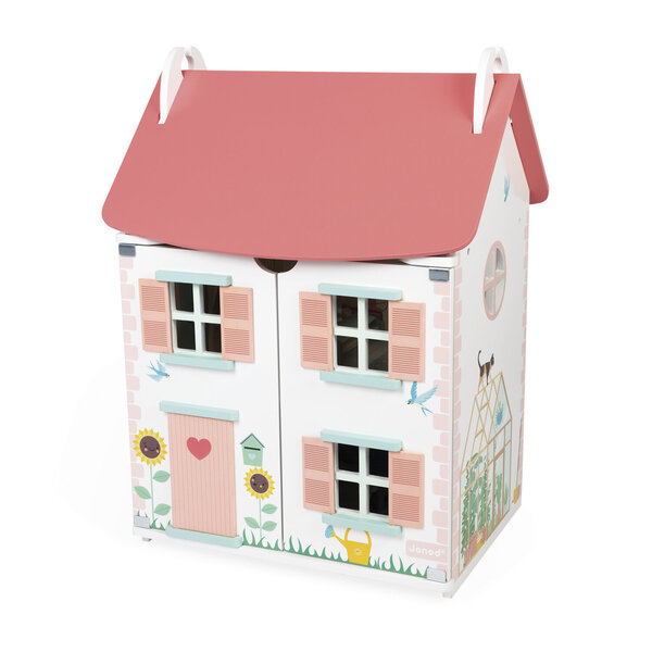 Bienvenue dans l'univers enchanteur de cette magnifique maison de poupées à trois étages ! Pleine de caractère et joliment décorée, elle est livrée avec tous les meubles assortis et quatre adorables figurines en bois pour des heures de jeu ! Ouvrez les portes pour découvrir chaque pièce : le salon, la salle à manger et la chambre. Disposez les meubles, donnez vie à vos figurines et refermez le tout pour un rangement facile. Avec ses pierres roses, ses papillons et ses petits arbres miniatures, cette maison respire la douceur et la gaieté. Pratique et astucieuse, elle s'ouvre également par le toit pour un accès facile à toutes les pièces. Les portes sont en outre magnétiques, ce qui permet de les fermer facilement. La maison de poupées est livrée avec quatre figurines, mais peut également accueillir des figurines mesurant jusqu'à environ 11,5 cm de haut. 11 accessoires sont fournis pour l'aménager à votre guise : une armoire à portes battantes, un lit avec une couverture, une coiffeuse, une baignoire, un canapé, une lampe, une table, deux chaises et un petit coin cuisine. Facile à monter pour un plaisir immédiat ! Jouet en bois certifié FSC™, adapté aux enfants à partir de 3 ans.