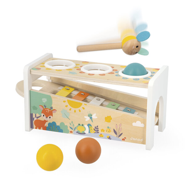 Qui souhaite tester sa motricité fine tout en développant son oreille musicale ? Ce joli jouet en bois 2-en-1 est à la fois éducatif et musical. Votre enfant utilise le marteau en forme d'abeille pour frapper les trois petites boules qui, en tombant, font résonner les touches du xylophone situé en dessous. Grâce au xylophone amovible, votre enfant peut jouer partout ! Développe la motricité fine et l'oreille musicale. Jouet en bois certifié FSC™. Jouet éducatif pour les enfants à partir de 12 mois.