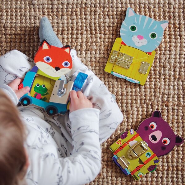 Avec Dejco Locktou, les enfants apprennent à ouvrir et fermer différents types de serrures de manière ludique. Un jeu de manipulation super amusant avec des animaux en bois qui ont chacun leur propre emplacement. Ouvrez une porte avec le chat, une porte de voiture avec une clé avec le renard et une mallette avec l'ours. Stimuler le développement de la motricité fine