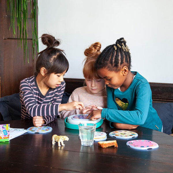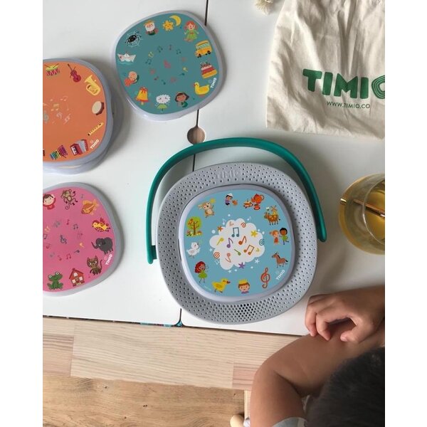 TIMIO est le lecteur audio et music interactif et éducatif pour les enfants. Le TIMIO est livré avec cinq disques magnétiques anti-rayures différents avec le sujet: animaux de la ferme, chants de Noël, véhicules, histoires audio, berceuses. Le lecteur de musique et les disques TIMIO sont utilisables à partir de 2 ans. Parce que les disques sont magnétiques, les petites mains des enfants peuvent facilement placer et retirer les disques. TIMIO est un divertissement entièrement sans écran, le lecteur audio et musique ne fonctionne qu'avec d'audio et des lumières LED. Aucune installation complexe ou connexion Internet n'est requise. Les enfants peuvent commencer à l'utiliser immédiatement. Il leur suffit de placer l'un des disques magnétiques sur le lecteur audio et de jouer! Étendre? Découvrez les kits d'extension TIMIO.