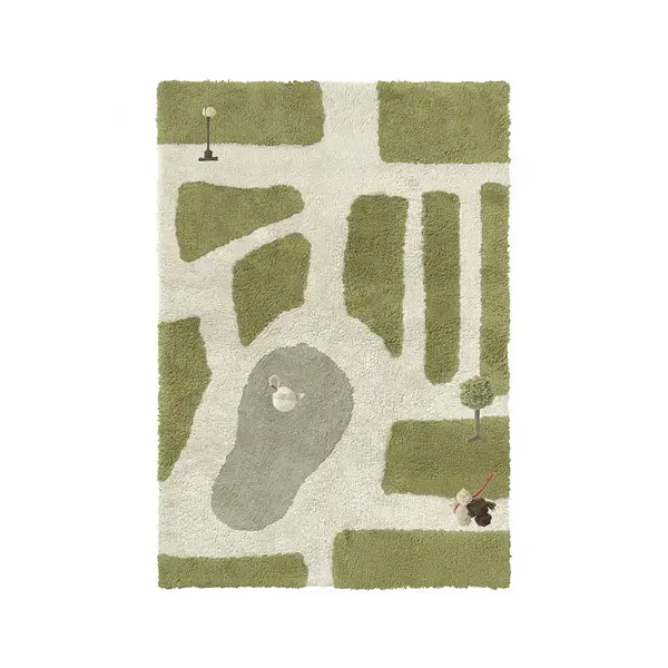 Une promenade dans Hyde Park ! Tapis de jeu rectangulaire en coton inspiré de l'emblématique Hyde Park à Londres. Comprend cinq accessoires faits main : un arbre, un lampadaire, un pont, un chien et un cygne, le tout rangé dans un sac en coton pratique. Chaque pièce est soigneusement fabriquée à la main à partir de matériaux tels que des cordes en coton, du bambou et des détails découpés à la main pour donner vie au parc.