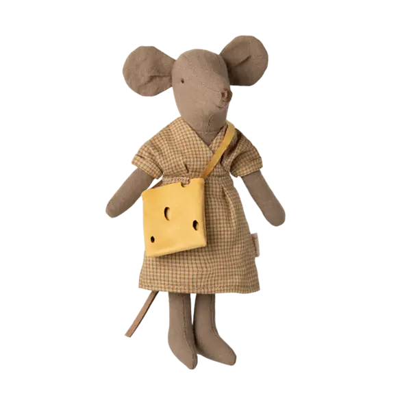 Souris maman en tissu marron clair. Elle porte une robe et un sac avec des trous pour le fromage. Cette souris s'adapte aux meubles et accessoires de la taille souris. Acheter d'autres vêtements séparément, les vêtements en taille maman/papa conviendront à cette souris.