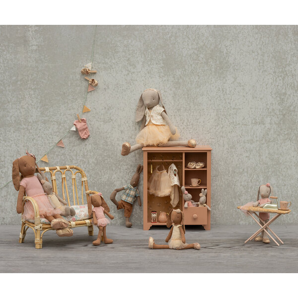 Une armoire en bois pour ranger les vêtements de vos lapins et ours en peluche ou tout simplement vos trésors préférés. Elle a une taille idéale pour être placée n'importe où dans la chambre d'enfant, car elle est trop grande pour les maisons de poupées Maileg.
