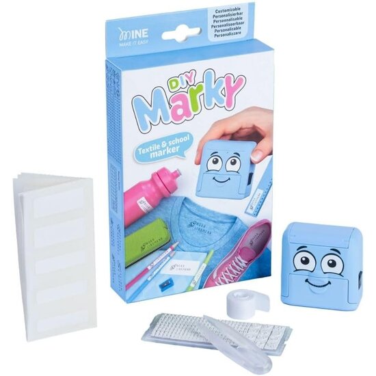 - Contenu : 1 tampon MARKY, 20 étiquettes, 1 m de ruban thermocollant, 1 jeu de pictogrammes et de lettres et 1 pince.