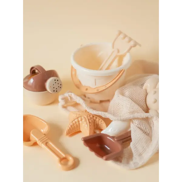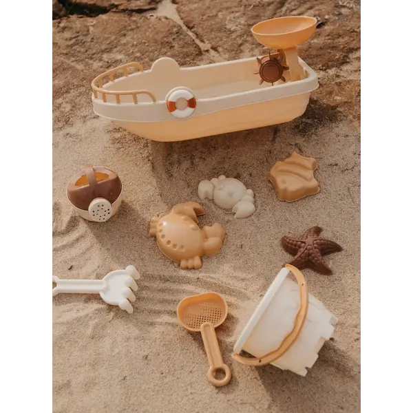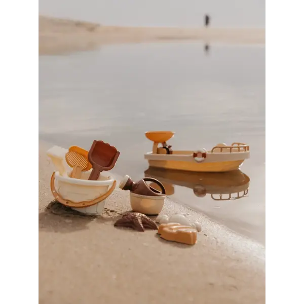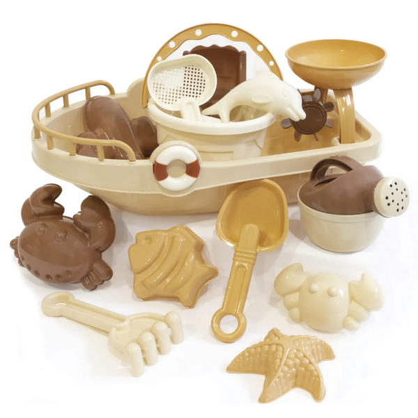 - Contenu : 4 pelles, 6 moules, 1 arrosoir, 1 seau, 1 moulin à eau et 1 bateau.