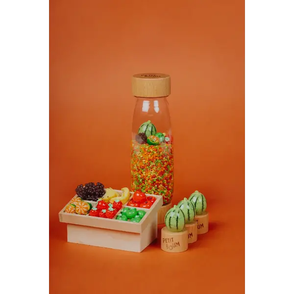 Apprendre à reconnaître les fruits n'a jamais été aussi amusant grâce à cette bouteille sensorielle pleine de formes et de couleurs. Il suffit de la secouer et... c'est l'heure de la récolte ! Mandarines, raisins, bananes, fraises... Choisissez vos fruits préférés et ne vous arrêtez pas avant de les avoir tous trouvés !