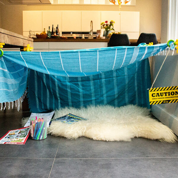 Avec Pl-ug tent kit, vous pouvez facilement construire la plus belle tente à l'intérieur ou à l'extérieur n'importe où, sans utiliser d'outils! Utilisez des objets autour de vous tels que des chaises, des fenêtres, des appuis de fenêtre et des tables d'appoint. Fixez le crochet, le bâton, la pince ou la ventouse de votre Pl-ug tent kit, assemblez la poignée et tirez le tissu à travers. Pl-ug est un joli système de construction de tente que les enfants de tous âges apprécient en laissant libre cours à leur imagination. Avec Pl-ug une tente différente chaque jour!