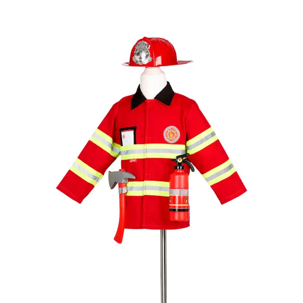 Tenue de pompier : veste, casque, hache, extincteur. Qualité : 100 % coton sergé. La longueur de la veste est de 50 cm.