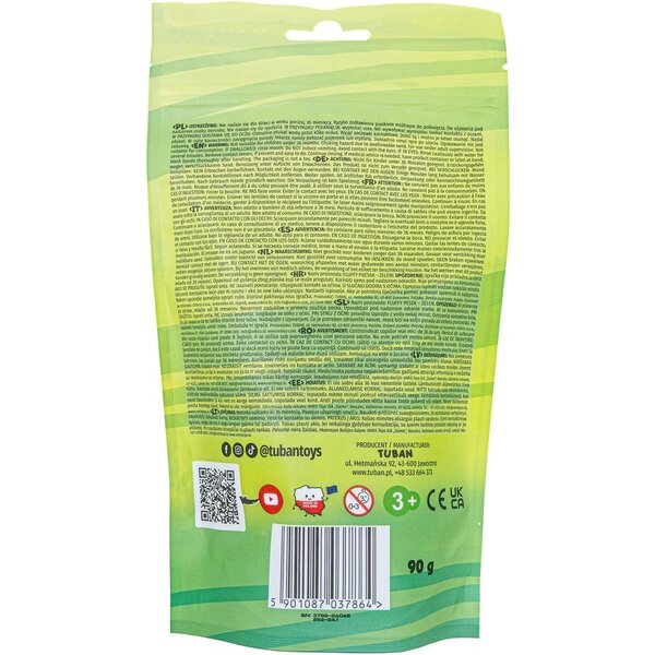 Dans un sachet, vous trouverez 90 grammes de l'unique sable Fluffy de couleur verte. Il s'agit d'un sable extraordinaire qui reste aérien et léger, même après plusieurs utilisations, et qui sent le chewing-gum. Fluffy Sand est facile à modeler et à pétrir. Il convient pour jouer avec des moules et ne colle pas aux mains.
